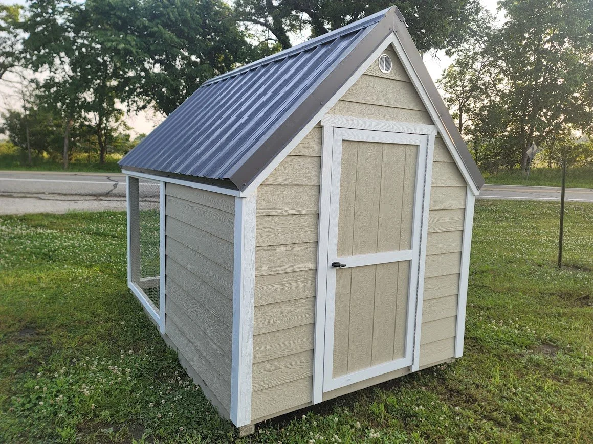 Series 4 building SN#1172 on the Three Rivers lot. 6x10 Chicken Coop. Treated flooring, LP Smart Siding, Fenced in area and nesting boxes, 40 year painted metal roof. 3’ chicken roost.